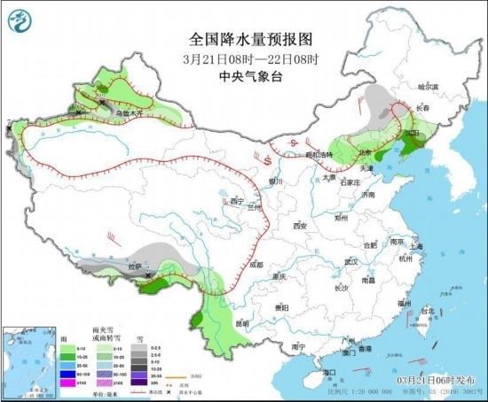 3月21日08時(shí)至22日08時(shí),新疆北部和南疆西部山區(qū)、內(nèi)蒙古東南部、遼寧西部和北部、河北北部、西藏東部和南部等地部分地區(qū)有小到中雪或雨夾雪,其中,新疆沿天山高海拔地區(qū)等地有大到暴雪,局地大暴雪(20~22毫米)。新疆伊犁河谷和準(zhǔn)噶爾盆地、遼寧東部和南部、北京、天津、云南中西部、西藏東南部等地部分地區(qū)有小雨,其中,遼東半島等地部分地區(qū)有中雨。青海東部、內(nèi)蒙古中西部和東南部、河北西北部等地部分地區(qū)有4~6級(jí)風(fēng)。臺(tái)灣海峽、巴士海峽、南海大部海域有6~8級(jí)風(fēng),陣風(fēng)9級(jí)。內(nèi)蒙古中西部部分地區(qū)有揚(yáng)沙或浮塵,局地有沙塵暴。