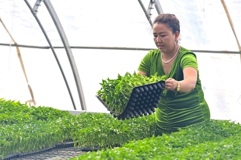 三月將盡,大漠乍暖還寒。坐落于戈壁灘邊緣的一座座溫室大棚內(nèi)滿目翠綠、暖意融融,米哈熱古麗·艾合麥提在一盤(pán)盤(pán)秧苗間麻利穿梭,額頭上的汗珠不時(shí)滾落。