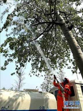 圖六:在北京豐臺區(qū),一名工作人員用高壓水槍對楊樹雌株進行噴水濕化以減少飛絮。(來源:新華社)
