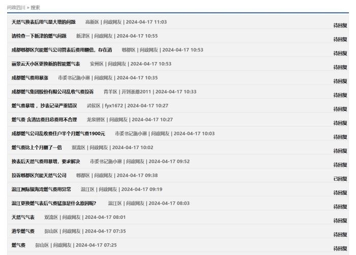 中新網(wǎng)4月17日電(中新財(cái)經(jīng)記者 吳濤)近日,在“問政四川”平臺上,不少網(wǎng)友反映“更換新表后燃?xì)赓M(fèi)異常上漲”,這些留言顯示來自四川成都、自貢、廣安、南充等多地,僅僅在4月16日,保守估計(jì)就有十幾條;17日上午又出現(xiàn)十幾條。大部分尚未得到回復(fù),部分獲得官方回復(fù)稱“留言已轉(zhuǎn)交給相關(guān)機(jī)構(gòu)進(jìn)行處理”。