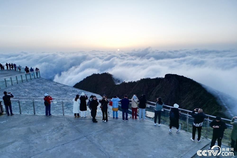四川雅安,牛背山雨后放晴,游客站在觀景平臺上欣賞“日出云?!本坝^。