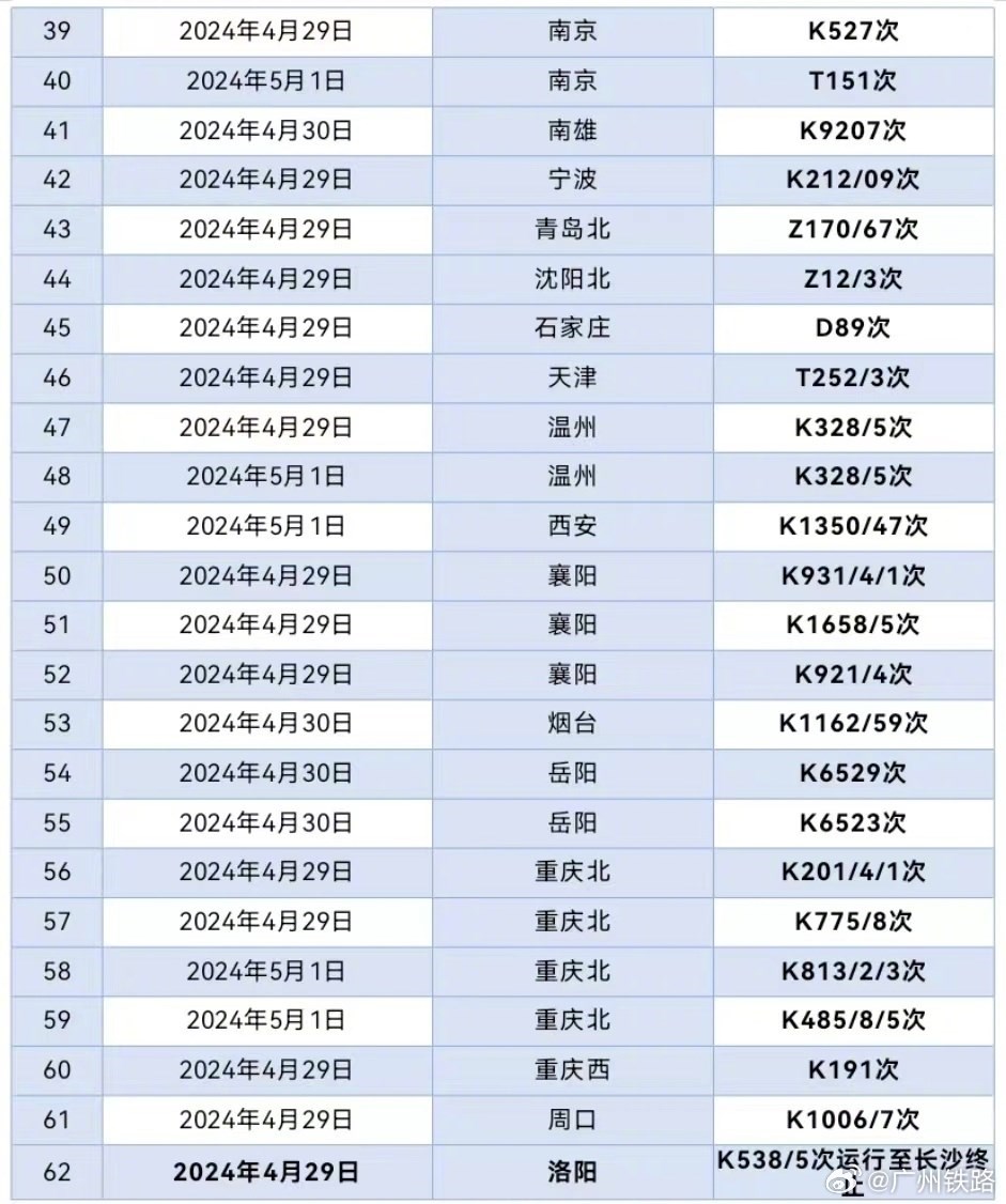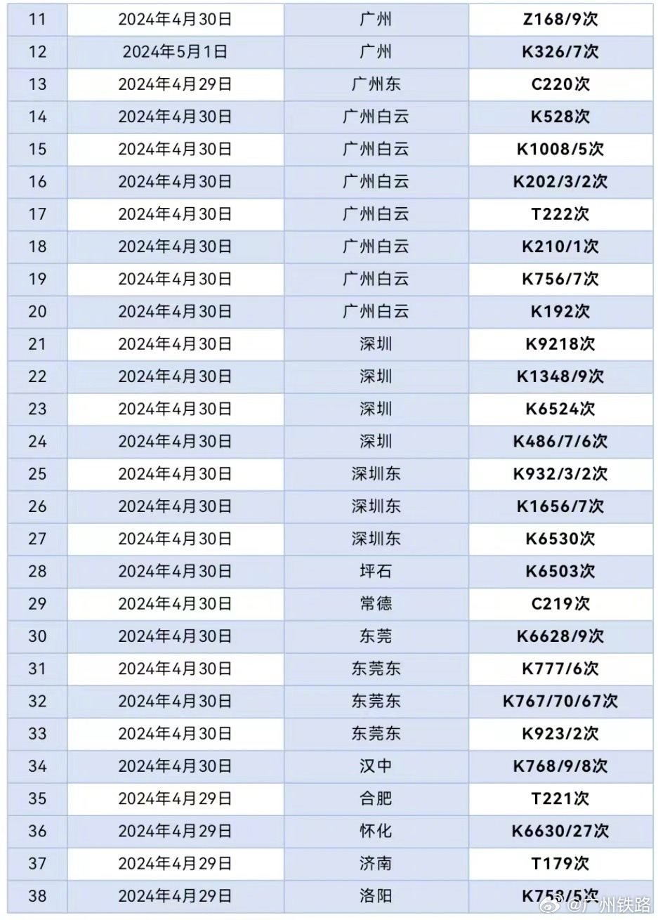 央視網(wǎng)消息:據(jù)@廣州鐵路 消息,據(jù)廣鐵集團(tuán)4月29日12時(shí)通報(bào),根據(jù)氣象部門消息,近期湖南大部、廣東中北部將出現(xiàn)較大范圍的大到暴雨,將對(duì)鐵路運(yùn)輸秩序造成一定的不利影響。廣鐵集團(tuán)于4月29日至5月1日期間計(jì)劃停運(yùn)京廣鐵路普速列車62列,京廣、京九普鐵和京廣高鐵的部分列車將出現(xiàn)不同程度晚點(diǎn)。