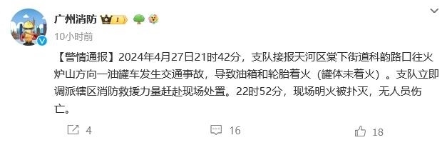 中新網(wǎng)4月28日電 據(jù)廣州消防微博消息,2024年4月27日21時(shí)42分,支隊(duì)接報(bào)天河區(qū)棠下街道科韻路口往火爐山方向一油罐車(chē)發(fā)生交通事故,導(dǎo)致油箱和輪胎著火(罐體未著火)。支隊(duì)立即調(diào)派轄區(qū)消防救援力量趕赴現(xiàn)場(chǎng)處置。22時(shí)52分,現(xiàn)場(chǎng)明火被撲滅,無(wú)人員傷亡。