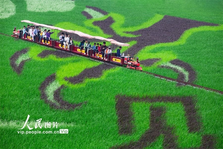 2024年5月2日,廣西南寧市賓陽(yáng)縣古辣鎮(zhèn)大陸村綠油油的田野上,“見龍?jiān)谔?國(guó)安家圓”大型中國(guó)龍主題稻田藝術(shù)畫吸引了許多游客前來參觀游覽。曾祥忠攝(人民圖片網(wǎng))
