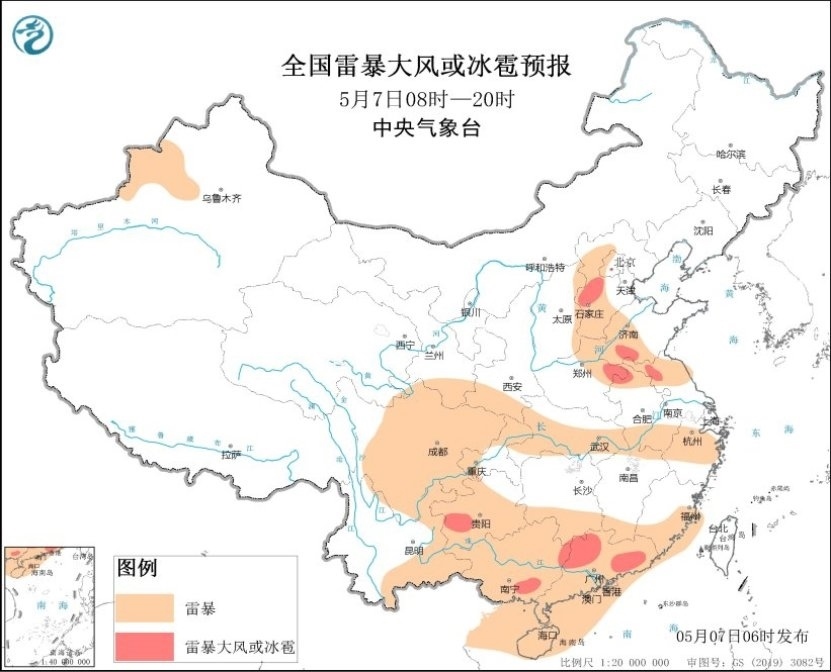 另外,今天白天,河北中部、山東西南部、河南東部、安徽北部、江蘇北部、貴州西南部、廣西中南部、廣東中北部等地的局地將有雷暴大風(fēng)或冰雹天氣,提醒當?shù)毓娨⒁夥烙箫L(fēng)或冰雹天氣。