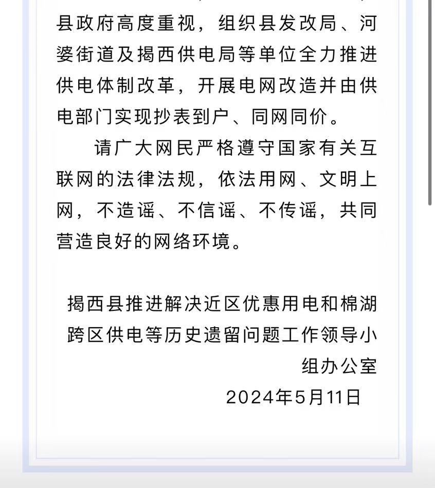 針對此事,“揭西發(fā)布”微信公眾號于5月12日發(fā)布了情況說明,表示對網(wǎng)上反映的“村民稱電費(fèi)從3毛漲到6毛8交不起”的問題高度重視,并已立即開展調(diào)查。