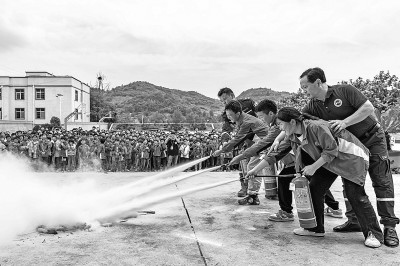 5月10日,藍(lán)天救援隊(duì)隊(duì)員在貴州省黔西市錦星鎮(zhèn)第二小學(xué)指導(dǎo)學(xué)生使用滅火器。新華社發(fā)