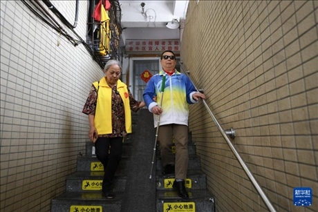 4月15日,馮懿蘋(右)與成都視障者互助協(xié)會(huì)家屬志愿者為樂(lè)隊(duì)成員準(zhǔn)備午飯。新華社記者 胥冰潔 攝