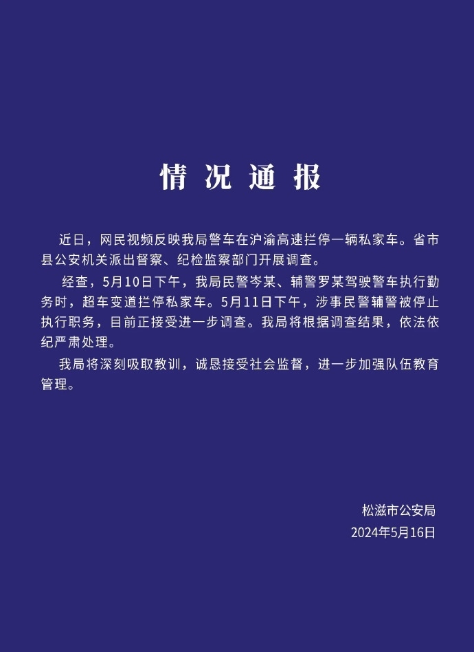 ·警車高速公路逼停小車,湖北松滋警方通報:涉事民輔警被停職。