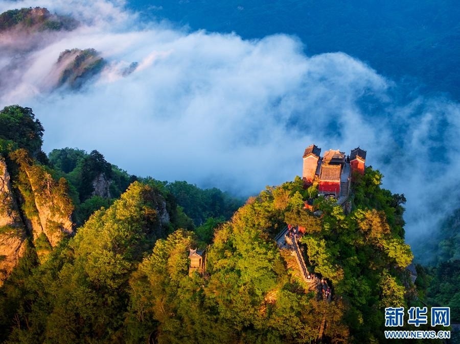 五月的武當山,云霧升騰,浩瀚無垠,靈性的古建筑若隱若現,如同水墨畫卷,勝似仙山瓊閣,氣勢磅礴,蔚為壯觀,給游客帶來無限遐想與向往。