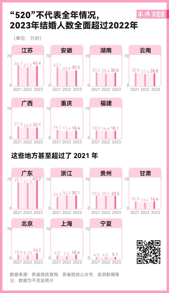 2023 年多地的“520”領(lǐng)證人數(shù)下跌,媒體報(bào)道稱“年輕人不太愿為愛(ài)結(jié)婚了”,但實(shí)際上,全年情況卻沒(méi)這么慘淡。