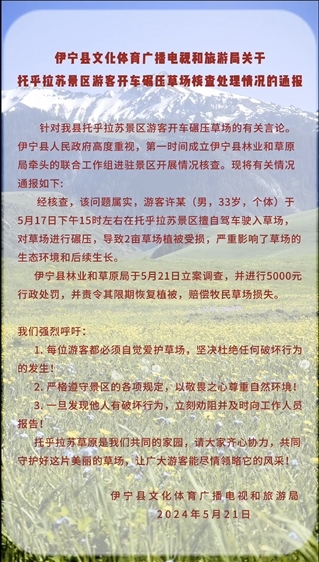 央視網(wǎng)消息:5月22日,新疆伊寧縣文旅局通報(bào),一游客開車碾壓草場已被立案調(diào)查。經(jīng)查,游客許某(男,33歲,個(gè)體)于5月17日15時(shí)左右在托乎拉蘇景區(qū)擅自駕車駛?cè)氩輬觯瑢?duì)草場進(jìn)行碾壓,導(dǎo)致2畝草場植被受損,嚴(yán)重影響了草場的生態(tài)環(huán)境和后續(xù)生長。伊寧縣林業(yè)和草原局于5月21日立案調(diào)查,并進(jìn)行5000元行政處罰,并責(zé)令其限期恢復(fù)植被,賠償牧民草場損失。