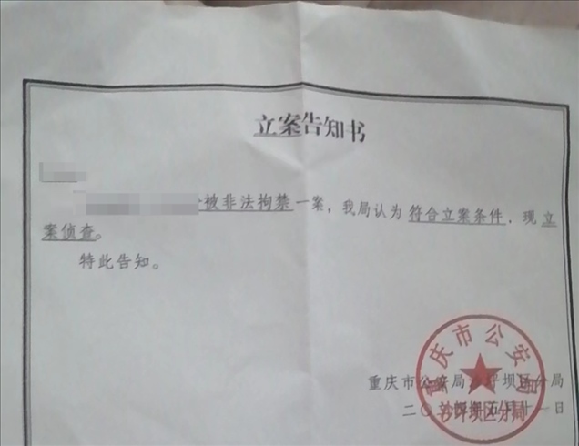事發(fā)后,家屬向當(dāng)?shù)嘏沙鏊鶊?bào)案。王先生出示的立案告知書顯示,5月11日,重慶市公安局沙坪壩區(qū)分局對(duì)前文中的夫妻倆被非法拘禁一案立案偵查。