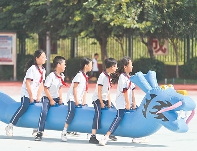 近年來(lái),廣西梧州將大象拔河、竹竿舞、打陀螺等民族體育項(xiàng)目引進(jìn)課堂,讓學(xué)生在享受運(yùn)動(dòng)快樂(lè)的同時(shí),接受民族團(tuán)結(jié)進(jìn)步教育。圖為近日當(dāng)?shù)匾凰W(xué)的學(xué)生體驗(yàn)“旱地龍舟”。