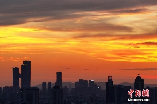 7月7日傍晚,南京上空漫天紅霞。近日,當(dāng)?shù)爻掷m(xù)高溫,同時(shí)“蒸”出晴好天氣。(無(wú)人機(jī)照片)