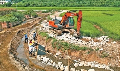 7月26日,湖南省洪江市巖垅鄉(xiāng)竹坪垅村,施工人員加緊修復被洪水沖毀的溪邊農(nóng)田保坎。楊錫建攝(人民視覺)