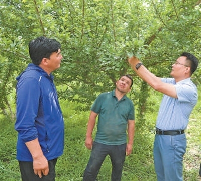 走進居民玉素普艾力·達吾提的果園,徐學(xué)彬正與果農(nóng)交流農(nóng)業(yè)知識:“今年人工授粉,掛果挺好,但還要把防蟲、疏果、施肥放在心上,這才能保證果實的品質(zhì)?!庇袼仄瞻Αみ_吾提連連點頭,說:“你放心,我記著!”