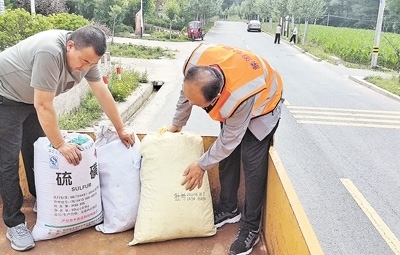 麟游縣農村公路發(fā)展服務中心養(yǎng)護工(右)在幫助群眾裝糧食。楊雅芳攝