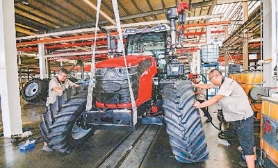 八月二十七日,山東青州經(jīng)濟開發(fā)區(qū)一家大馬力拖拉機制造企業(yè)內(nèi),工人正在車間進行裝配作業(yè)。王繼林攝(人民視覺)