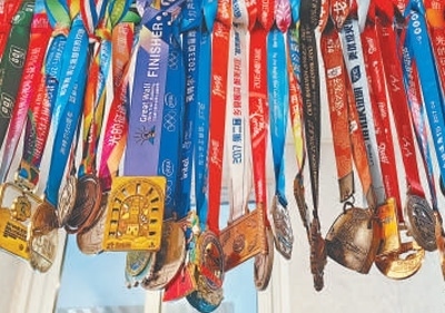 何亞君的馬拉松獎牌。 本報記者 易舒冉攝