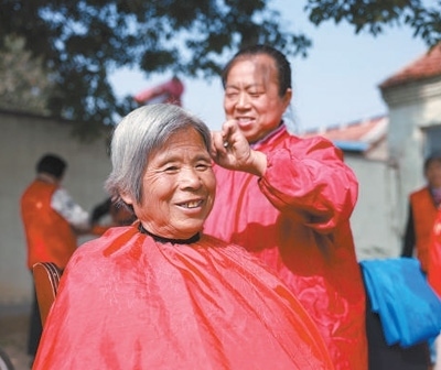 德化人心山東省東營(yíng)市廣饒縣開展形式多樣的活動(dòng),弘揚(yáng)愛老敬老的優(yōu)良傳統(tǒng)。圖為在廣饒縣李鵲鎮(zhèn)趙寺村,志愿者為老人理發(fā)。劉云杰攝(影像中國(guó))