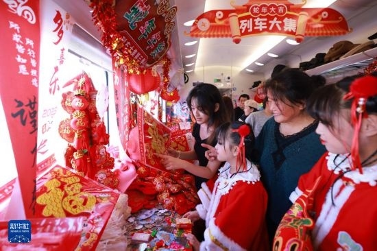 1月17日,在4187次列車(chē)的“列車(chē)大集”上,旅客在挑選春聯(lián)和“?!弊?。