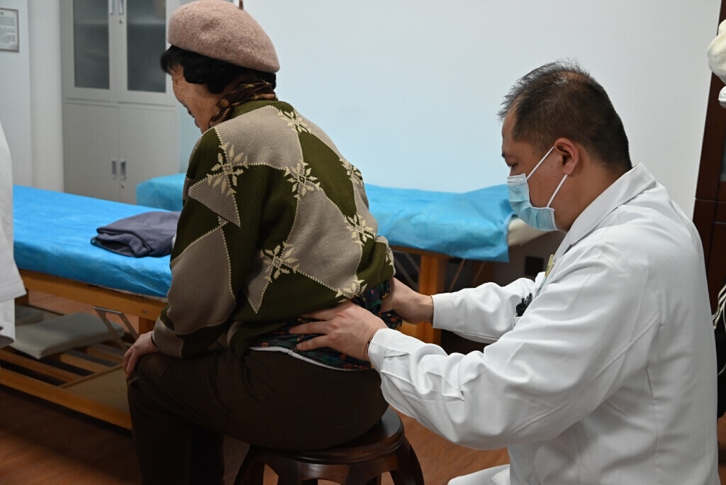 1月20日,二〇五所社區(qū)衛(wèi)生服務站中醫(yī)館針灸科主任陳輝為居民伍麗(化名)按摩。林敬 攝