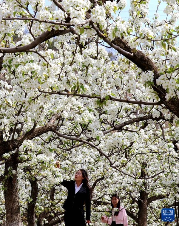 4月25日,在位于黃土高原的甘肅省平?jīng)鍪徐o寧縣界石鋪鎮(zhèn)李堡村,游客在梨園里賞花。