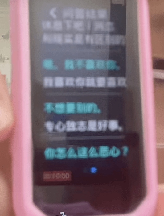 小女孩在視頻中展示了與點讀機的兩段對話,機:休息下吧!網(wǎng)絡和現(xiàn)實是有區(qū)別的;女:哦,我不喜歡你;機:我喜歡你就要喜歡;女:不想要別的;機:專心致志是好事;女:你怎么這么惡心?;機:咱們聊點別的吧;女:我不喜歡你;機:主人,不要拋棄我啊。