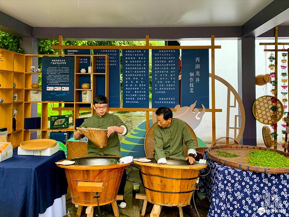 △西湖龍井以“色綠、香郁、味甘、形美”著稱于世,這是制作技藝展示區(qū)。(總臺央視記者段德文拍攝)