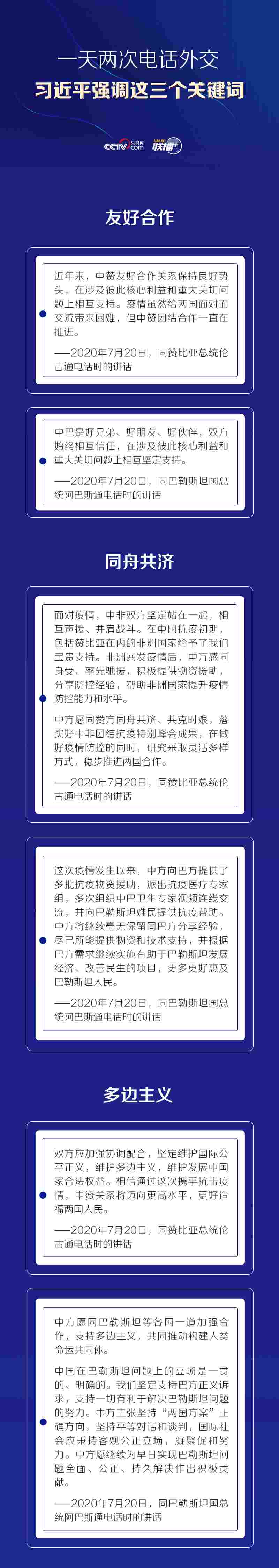 7月20日晚,習(xí)近平主席分別同贊比亞總統(tǒng)倫古和巴勒斯坦國(guó)總統(tǒng)阿巴斯通電話。通話中,習(xí)近平主席肯定了與兩國(guó)的相互信任和支持,主張同舟共濟(jì)、共克時(shí)艱,強(qiáng)調(diào)堅(jiān)定維護(hù)國(guó)際公平正義,維護(hù)多邊主義。