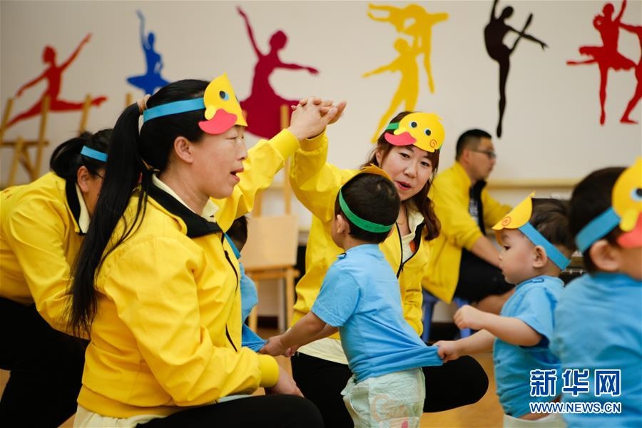 在呼和浩特市兒童福利院舉行的“心懷感恩·多彩六一”文藝演出活動(dòng)上,孩子們和老師一起表演(2018年6月1日攝)。新華社記者虞東升攝