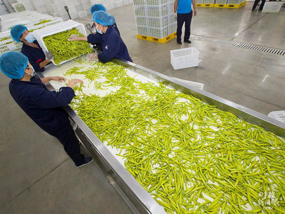 △7月中旬,山西大同黃花進入采摘季。經(jīng)過清洗、篩選,最終由工人裝車推入烘干房。