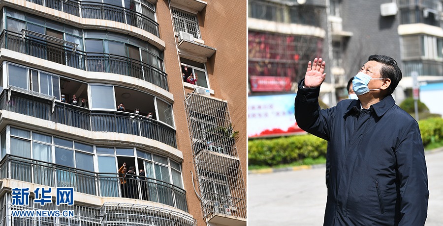 3月10日,習(xí)近平專門赴湖北省武漢市考察新冠肺炎疫情防控工作。這是習(xí)近平在東湖新城社區(qū)考察時,向在家隔離居住的居民揮手致意、表示慰問(拼版照片)。