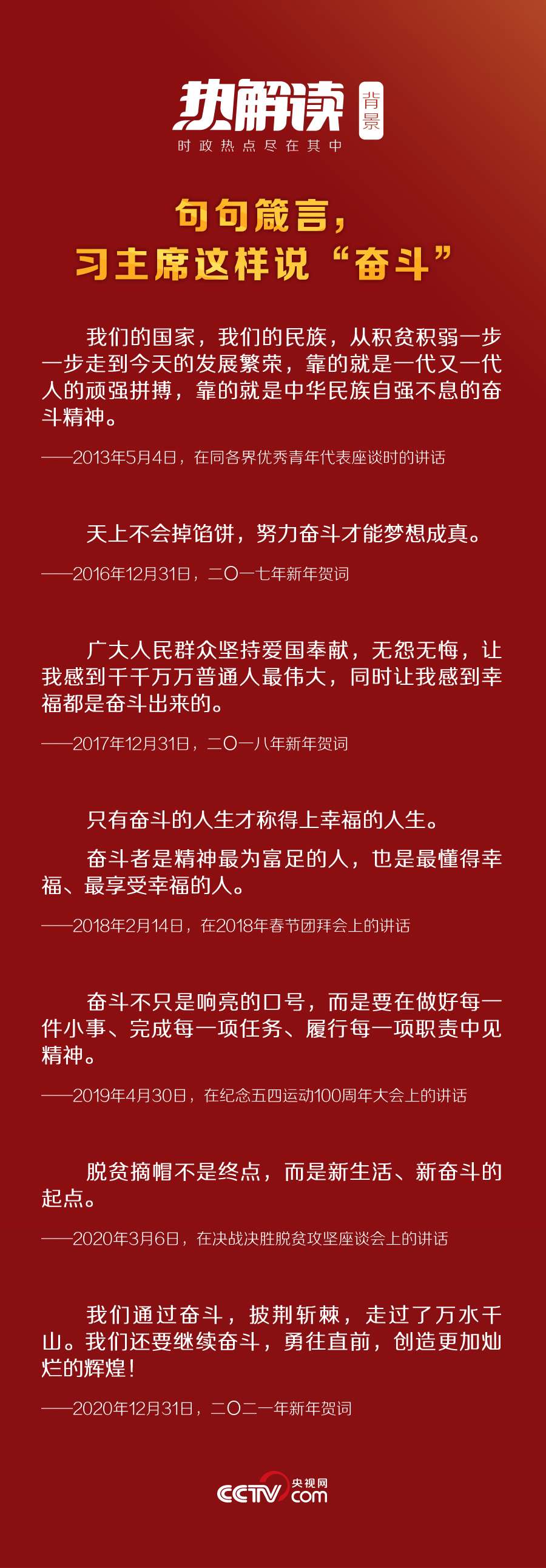 2020年,“十三五”圓滿收官,“十四五”全面擘畫;2021年,既是“十四五”開局之年,又是“兩個(gè)一百年”的歷史交匯點(diǎn),全面建設(shè)社會(huì)主義現(xiàn)代化國(guó)家新征程即將開啟。在這個(gè)關(guān)鍵節(jié)點(diǎn)再次強(qiáng)調(diào)“奮斗”,習(xí)近平主席意蘊(yùn)深遠(yuǎn)。