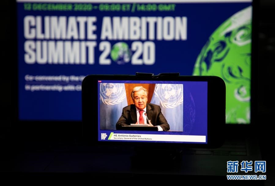 這是2020年12月12日在美國紐約拍攝的聯(lián)合國秘書長古特雷斯在氣候雄心峰會上通過視頻發(fā)表講話的屏幕畫面。氣候雄心峰會由聯(lián)合國及有關(guān)國家倡議舉辦,旨在紀(jì)念《巴黎協(xié)定》達(dá)成五周年,進(jìn)一步動員國際社會強(qiáng)化氣候行動,推進(jìn)多邊進(jìn)程。新華社記者