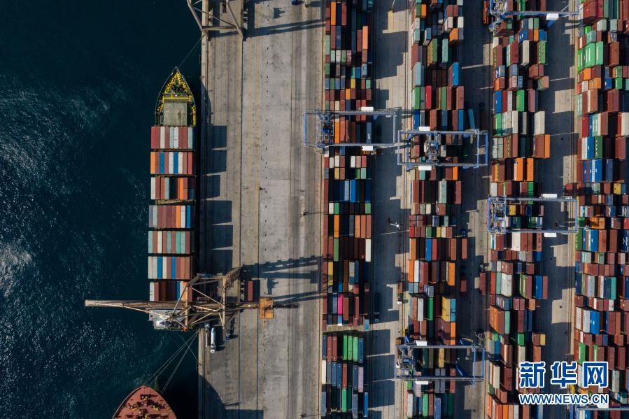 這是2019年9月6日航拍的??吭谙ED比雷埃夫斯港集裝箱碼頭的中遠(yuǎn)海運(yùn)銀河輪。新華社發(fā)(萊夫特里斯·帕察里斯攝)