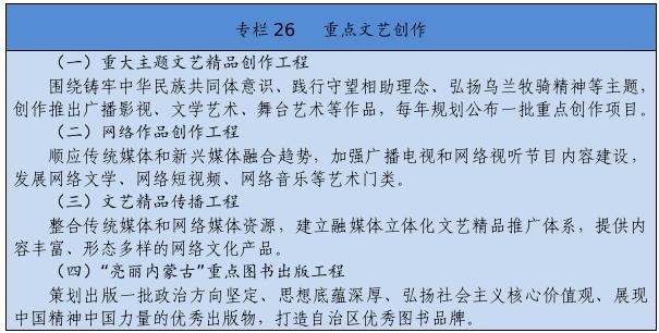 堅持以人民為中心的創(chuàng)作導向,創(chuàng)作生產(chǎn)出人民喜聞樂見的優(yōu)秀作品。繁榮發(fā)展新聞出版、廣播影視、文學藝術,實施文藝作品質(zhì)量提升工程,加強優(yōu)秀劇本孵化和生活采風。推動重大主題文藝精品創(chuàng)作,加強現(xiàn)實題材創(chuàng)作生產(chǎn)。改進重點作品創(chuàng)作引導機制,建立重點文化藝術項目滾動扶持機制。設立內(nèi)蒙古文化藝術發(fā)展專項資金。加強文化文藝場館建設。制定文藝人才發(fā)展規(guī)劃,開展內(nèi)蒙古電影新導演計劃。實施文化潤心工程,以文藝創(chuàng)作鑄牢中華民族共同體意識。提升廣播電視和網(wǎng)絡視聽產(chǎn)品質(zhì)量,豐富網(wǎng)絡文藝內(nèi)容。搭建文藝精品遴選、展示、推出平臺,建設內(nèi)蒙古音樂廳,支持因地制宜建設綜合劇場、音樂廳和美術館,舉辦內(nèi)蒙古藝術節(jié)、內(nèi)蒙古音樂節(jié)等活動,大力實施文藝惠民演出和地方戲傳承創(chuàng)新工程,定期舉辦全區(qū)地方戲優(yōu)秀劇目展演以及音樂、舞蹈、小戲小品專業(yè)賽事,打造獨具特色的文化藝術品牌。