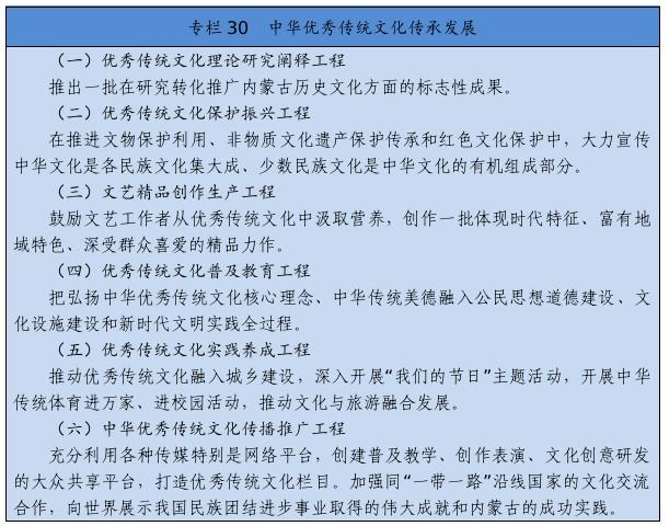實施文化遺產(chǎn)系統(tǒng)性保護工程,強化重要文化和自然遺產(chǎn)、非物質(zhì)文化遺產(chǎn)系統(tǒng)性保護,建立整體保護、活態(tài)傳承、創(chuàng)新發(fā)展體系。實施重大文物保護工程,推進長城、黃河國家文化公園和大窯、遼上京、和林格爾土城子等國家考古遺址公園建設。推動萬里茶道(內(nèi)蒙古段)、遼上京和祖陵遺址、紅山遺址群和陰山巖刻申遺。加強阿爾寨石窟寺等石窟文物保護。開展“中華文明探源”工程、“考古中國”河套地區(qū)早期聚落遺址考古發(fā)掘研究。建設內(nèi)蒙古非遺博覽園、內(nèi)蒙古黃河文化博物館、內(nèi)蒙古工業(yè)博物館。加強紀念館、展覽館、博物館建設管理。推進民族優(yōu)秀傳統(tǒng)手工藝保護傳承和振興,完善非遺名錄體系。實施中華傳統(tǒng)節(jié)日振興工程,開展傳統(tǒng)節(jié)日禮儀禮節(jié)教育活動。