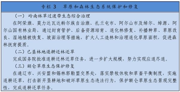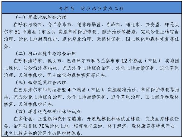 繼續(xù)實施京津風沙源治理等重點工程,推廣庫布其沙漠治理方式和沙產(chǎn)業(yè)模式,推動渾善達克、烏珠穆沁、呼倫貝爾沙地治理。推進規(guī)?;謭鼋ㄔO,采取人工造林、封沙育林、飛播造林等方式恢復植被。建設荒漠綠洲防護林、防風固沙林、沙漠鎖邊林、農(nóng)田草牧場防護林以及水土保持林。以干旱半干旱草原為重點,加強草場改良和人工種草,實行圍封禁牧、劃區(qū)輪牧、季節(jié)性休牧、舍飼圈養(yǎng)等措施,保護和恢復草原植被。以內(nèi)蒙古高原等為重點,推進防護林體系建設及退化林修復、退化草原修復、京津風沙源治理。新增水土流失綜合治理3.33萬平方公里。