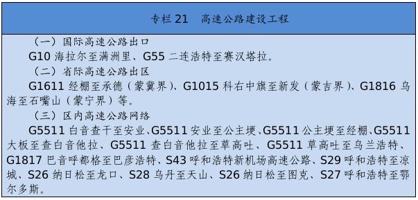 基礎設施保障更加有力。交通運輸、能源外送通道和引調(diào)水骨干工程接續(xù)落地。綜合交通運輸體系基本形成,接入全國高鐵網(wǎng),呼和浩特至張家口高速鐵路,通遼、赤峰至京沈高速鐵路連接線,浩勒報吉至吉安鐵路順利建成,建成高速鐵路404公里。全區(qū)103個旗縣(市區(qū))全部通高等級公路,京新高速臨河至哈密、丹錫高速錫林浩特至巴林右旗等高速公路通車運營,所有鄉(xiāng)鎮(zhèn)(蘇木)和具備條件的建制村通硬化路,建成“四好農(nóng)村路”6.6萬公里,綜合交通網(wǎng)總里程達到22.5萬公里。呼和浩特新機場開工建設,呼倫貝爾、包頭、通遼等機場完成改擴建。新建通用機場15個,民用機場達到40個。黃河內(nèi)蒙古段二期防洪、引綽濟遼、東臺子水庫等重大水利工程建設順利推進。全區(qū)5G基站突破1萬個。建成5條特高壓外送電通道??耸部蓑v至北京煤制氣管道投入運營。呼和浩特地鐵1、2號線一期工程建成運營。