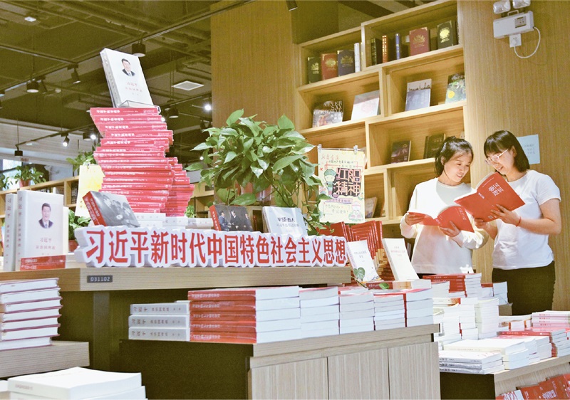 黨確立習(xí)近平同志黨中央的核心、全黨的核心地位,確立習(xí)近平新時(shí)代中國(guó)特色社會(huì)主義思想的指導(dǎo)地位,反映了全黨全軍全國(guó)各族人民共同心愿,對(duì)新時(shí)代黨和國(guó)家事業(yè)發(fā)展、對(duì)推進(jìn)中華民族偉大復(fù)興歷史進(jìn)程具有決定性意義。圖為2021年10月4日,河南省焦作市博愛(ài)縣新華書店里,讀者在閱讀習(xí)近平新時(shí)代中國(guó)特色社會(huì)主義思想相關(guān)書籍?!≈行律绨l(fā) 程全/攝