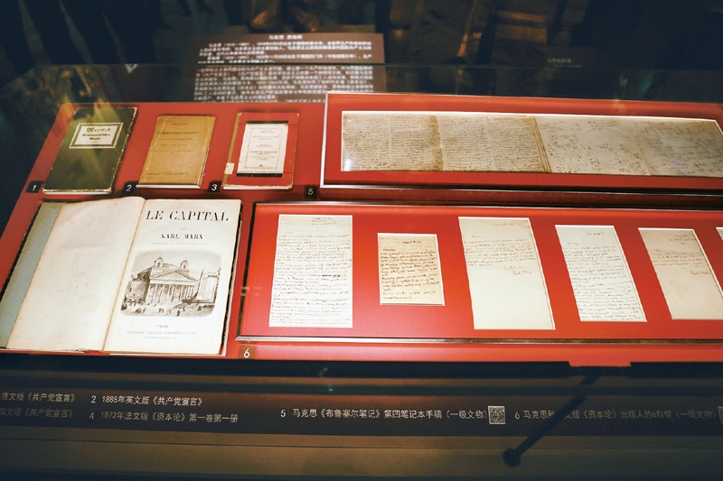 中國(guó)共產(chǎn)黨歷史展覽館的展廳里,陳列著多份珍貴的馬克思手稿。右上為馬克思《布魯塞爾筆記》第四筆記本手稿;右下為馬克思寫給《資本論》法文版出版人的六封書信?!≈行律绨l(fā) 陳曉根/攝