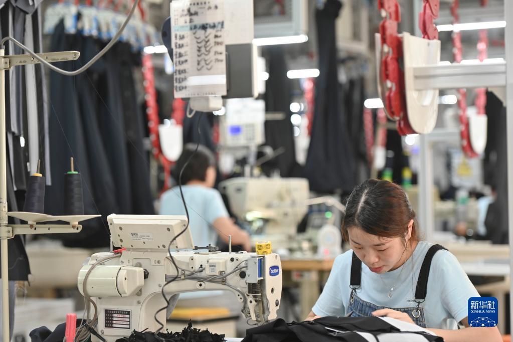 在位于福建省泉州市經(jīng)濟(jì)技術(shù)開(kāi)發(fā)區(qū)的九牧王西褲智能化生產(chǎn)車間,工人在自動(dòng)化西褲吊掛流水線上作業(yè)(7月30日攝)。新華社記者宋為偉攝