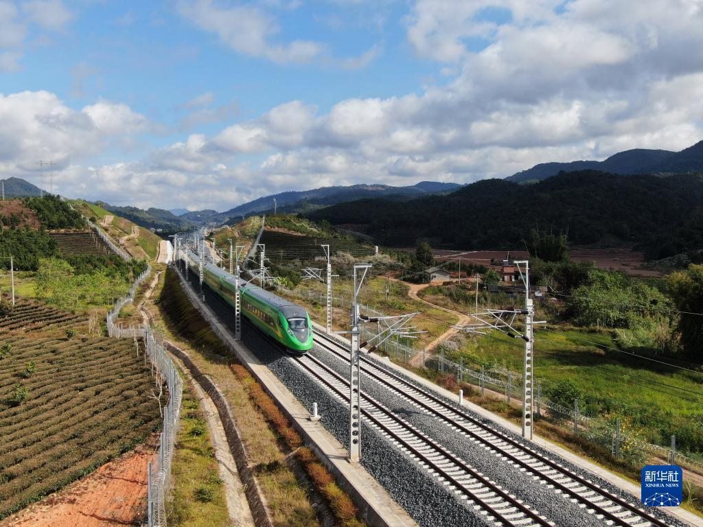 2022年1月3日,列車行駛在位于云南西雙版納傣族自治州景洪市境內(nèi)的中老鐵路上(無(wú)人機(jī)照片)。新華社發(fā)(李云生攝)