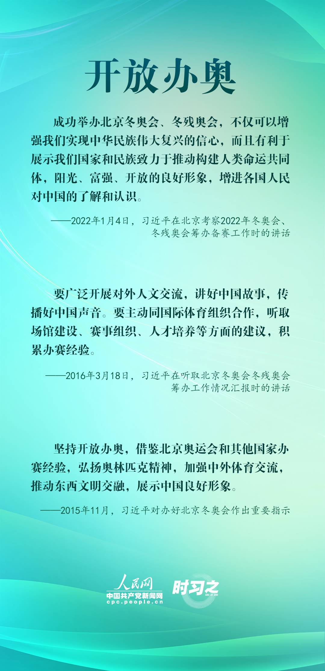 1月4日,習(xí)近平在北京考察2022年冬奧會、冬殘奧會籌辦備賽工作,指出“要堅持綠色辦奧、共享辦奧、開放辦奧、廉潔辦奧的理念,突出科技、智慧、綠色、節(jié)儉特色”。辦好北京冬奧會、冬殘奧會,是中國向國際社會作出的莊嚴承諾。習(xí)近平多次調(diào)研并強調(diào)綠色、共享、開放、廉潔的辦奧理念。