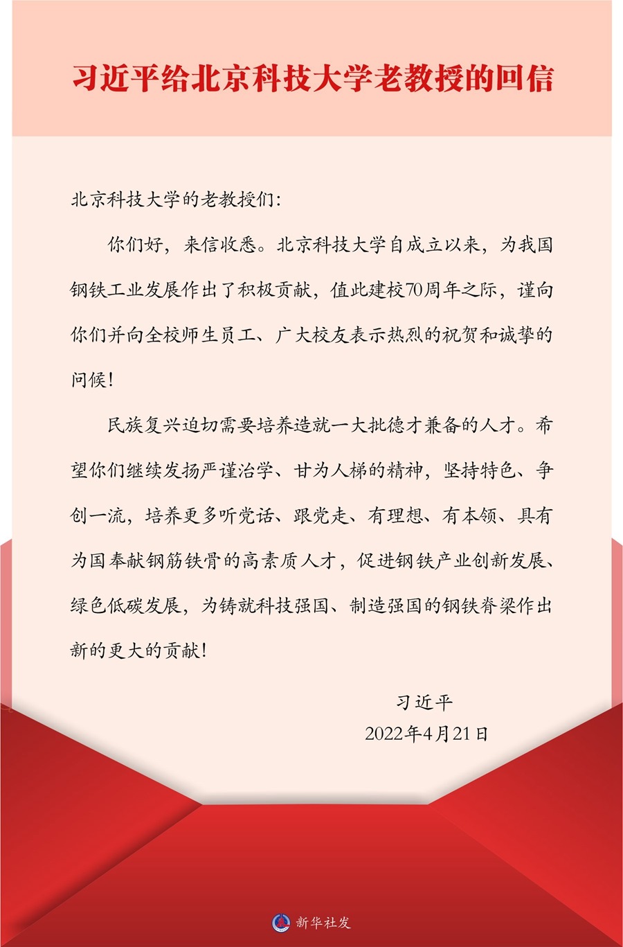 習近平在回信中說,北京科技大學自成立以來,為我國鋼鐵工業(yè)發(fā)展作出了積極貢獻,值此建校70周年之際,謹向你們并向全校師生員工、廣大校友表示熱烈的祝賀和誠摯的問候!