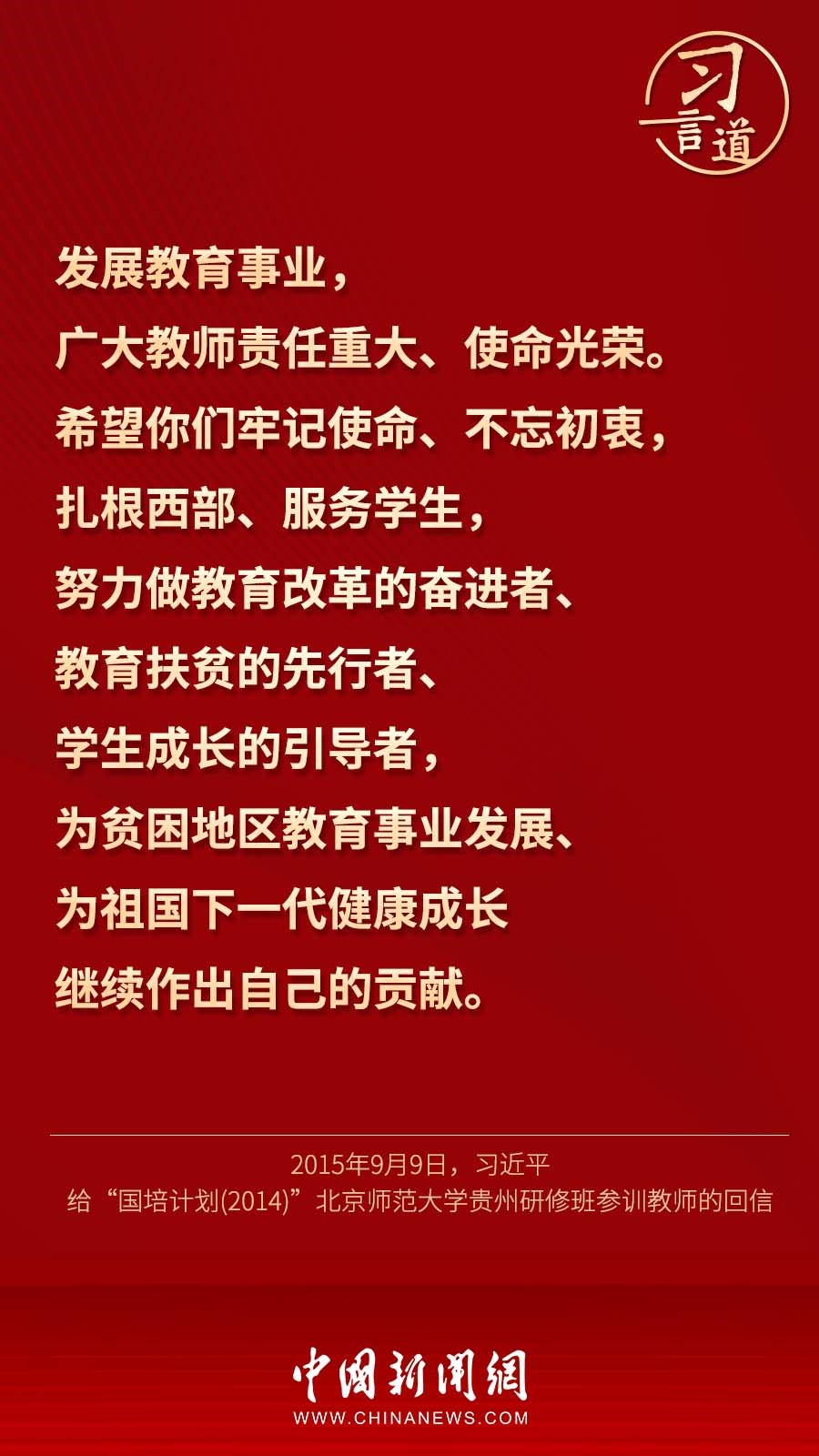 9月7日,習近平總書記回信勉勵北京師范大學“優(yōu)師計劃”師范生,努力成為黨和人民滿意的“四有”好老師。十八大以來,習近平多次通過書信的形式,對教師群體寄予殷切期望。
