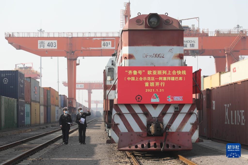 膠州海關(guān)關(guān)員對(duì)“齊魯號(hào)”歐亞班列上合快線(xiàn)(中國(guó)上合示范區(qū)——阿塞拜疆巴庫(kù))線(xiàn)路首班列車(chē)進(jìn)行檢查(2021年1月31日攝)。新華社發(fā)(解豪攝)