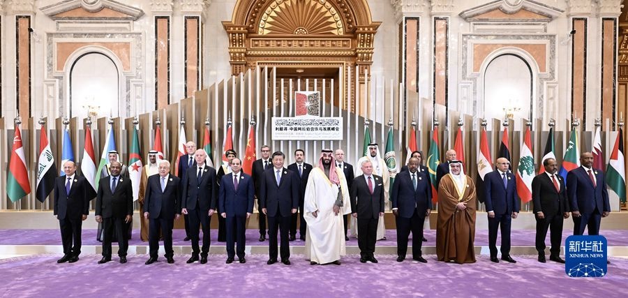 當(dāng)?shù)貢r(shí)間12月9日下午,首屆中國(guó)-阿拉伯國(guó)家峰會(huì)在沙特首都利雅得阿卜杜勒阿齊茲國(guó)王國(guó)際會(huì)議中心舉行。國(guó)家主席習(xí)近平和沙特王儲(chǔ)兼首相穆罕默德、埃及總統(tǒng)塞西、約旦國(guó)王阿卜杜拉二世、巴林國(guó)王哈馬德、科威特王儲(chǔ)米沙勒、突尼斯總統(tǒng)賽義德、吉布提總統(tǒng)蓋萊、巴勒斯坦總統(tǒng)阿巴斯、卡塔爾埃米爾塔米姆、科摩羅總統(tǒng)阿扎利、毛里塔尼亞總統(tǒng)加茲瓦尼、伊拉克總理蘇達(dá)尼、摩洛哥首相阿赫努什、阿爾及利亞總理阿卜杜拉赫曼、黎巴嫩總理米卡提等21個(gè)阿盟國(guó)家領(lǐng)導(dǎo)人以及阿拉伯國(guó)家聯(lián)盟秘書長(zhǎng)蓋特等國(guó)際組織負(fù)責(zé)人出席峰會(huì)。習(xí)近平在會(huì)上發(fā)表題為《弘揚(yáng)中阿友好精神 攜手構(gòu)建面向新時(shí)代的中阿命運(yùn)共同體》的主旨講話。新華社記者 謝環(huán)馳 攝